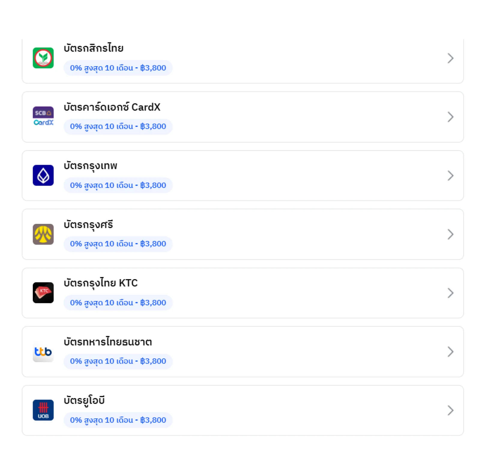 เมื่อมียอดซื้อสินค้าหรือบริการตั้งแต่ 3,000 บาทขึ้นไป สามารถเลือกผ่อนชำระได้นาน 3 – 10 เดือน ผ่านบัตรเครดิตชั้นนำ รวมไปถึงสามารถทำผ่อน 0% ได้อีกด้วย ตามบัตรดังนี้: